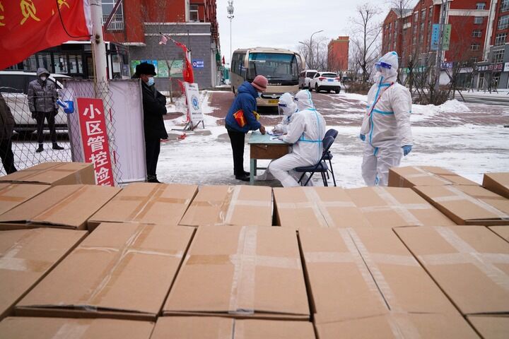11月10日,在黑龙江省黑河市一小区,社区工作人员为居民发放免费生活物资。新华社记者王松摄